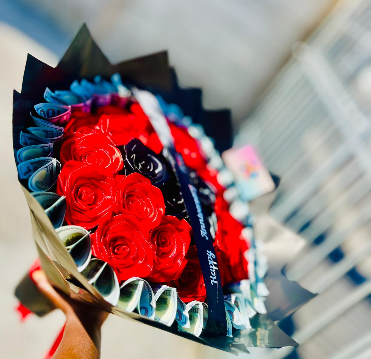 + Free Shipping25count Satin , red and black roses+ fake $100 notes