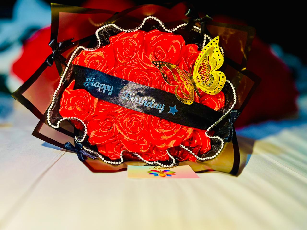 Happy Birthday Banner + Red Satin Rose + Butterfly, + Black and White Pearl Wrap + Tiny Black Bows